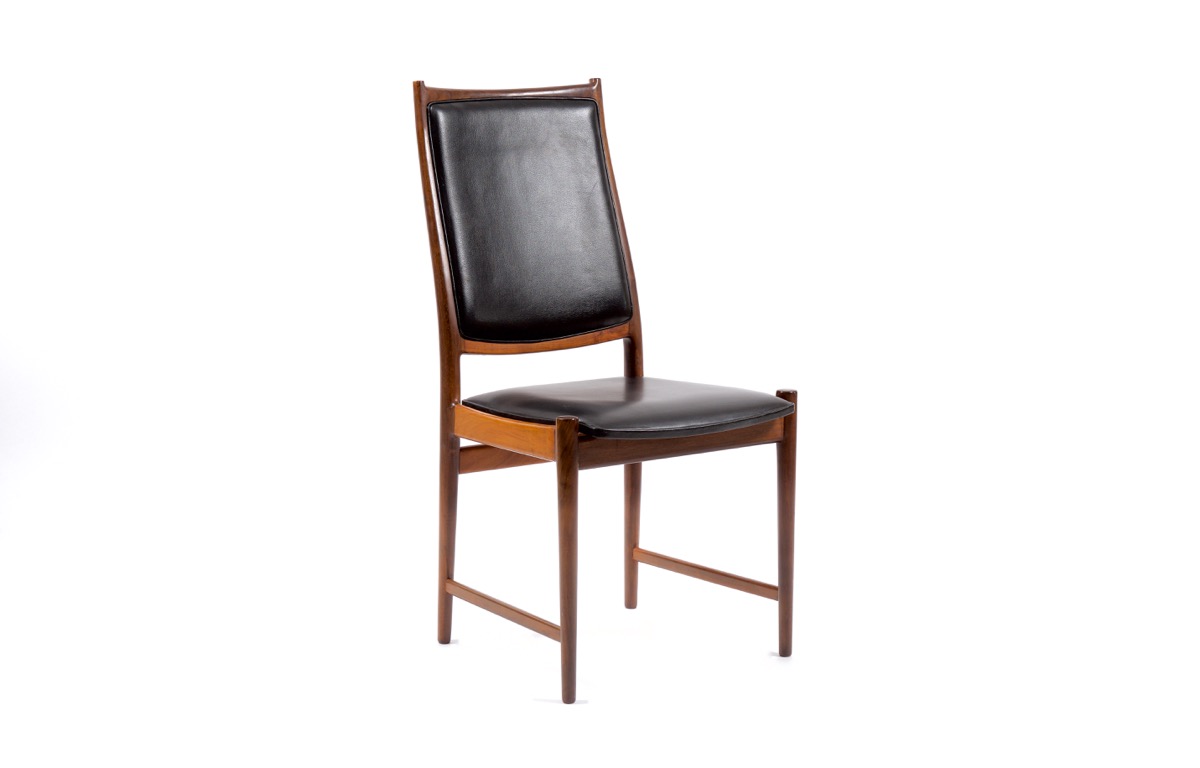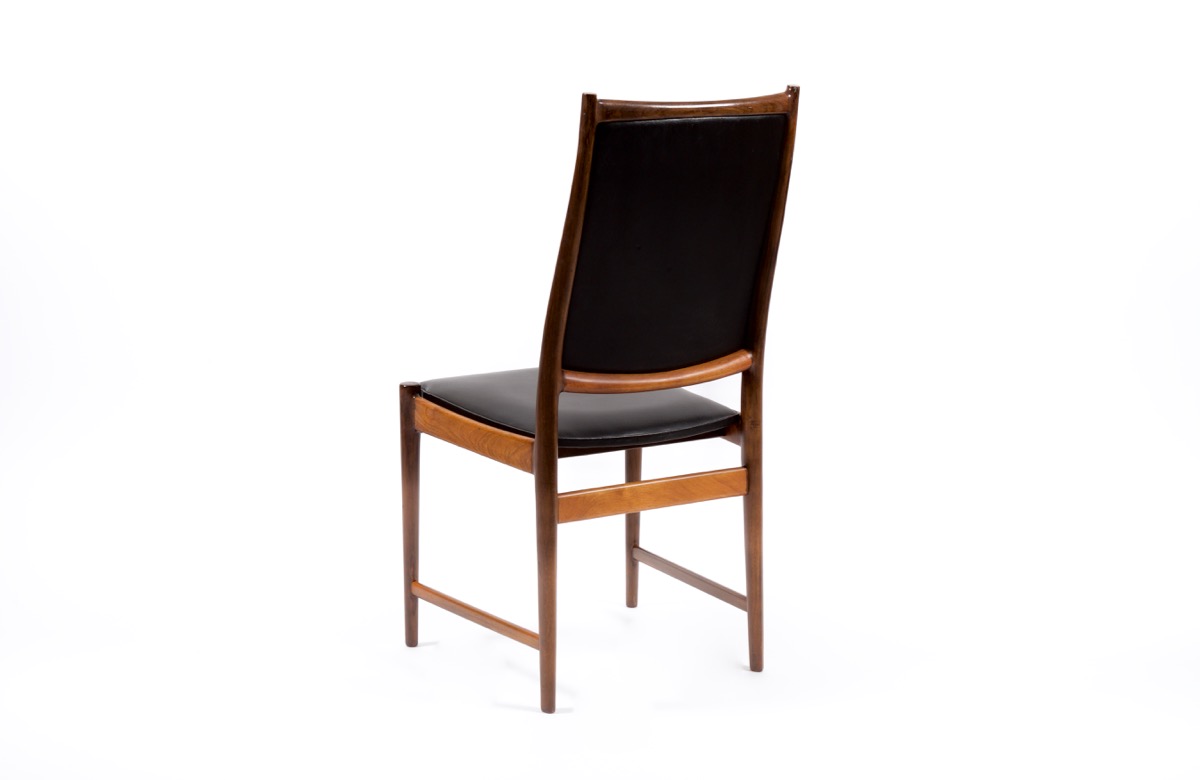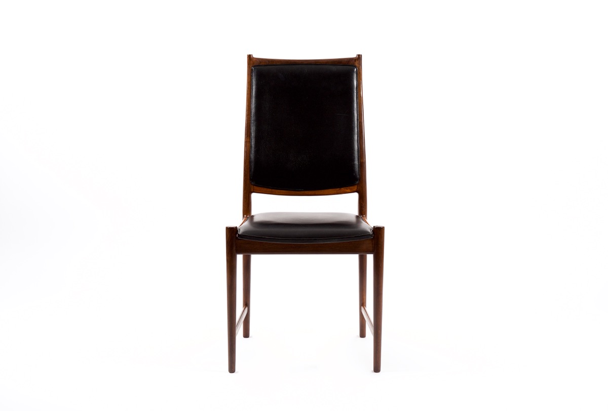 Rosewood/ black leather high back chairs. Vintage object. Very good original condition.