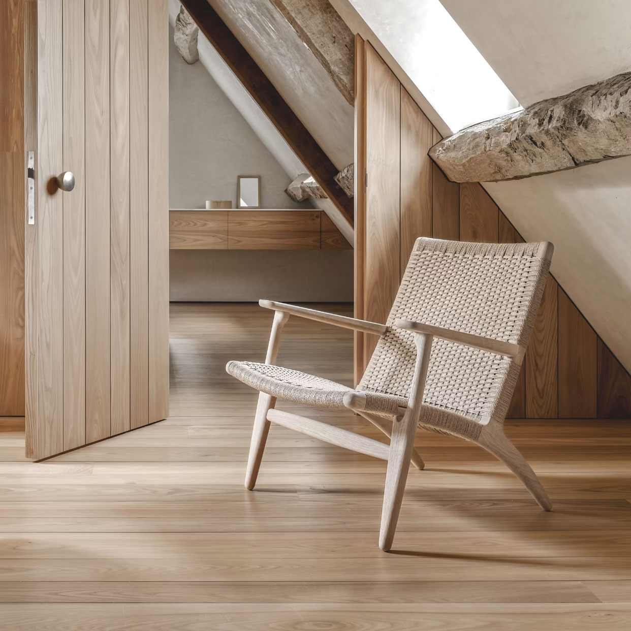 The CH25 lounge chair, like many of Hans J. Wegner’s other iconic designs, is clean and simple in its distinctive shape. But its introduction caused a stir due to Wegner’s choice of materials on the backrest and seat. The woven paper cord, a replacement for seagrass developed during World War II, had not been used in furniture before. However, Wegner was enthusiastic about the look of the material and its non-stretching and optimal durability, and so were generations after him. The CH25 lounge chair has remained tremendously popular and has been in continuous production since 1950: a testament to Wegner’s visionary approach. It takes a skilled craftsman 10 hours and approximately 400 meters of paper cord to complete one seat and backrest by hand, using a particular technique resembling weaving, which is visible on both sides of the backrest. The striking result of this exacting process is an exceptional chair that is fascinating from all angles.