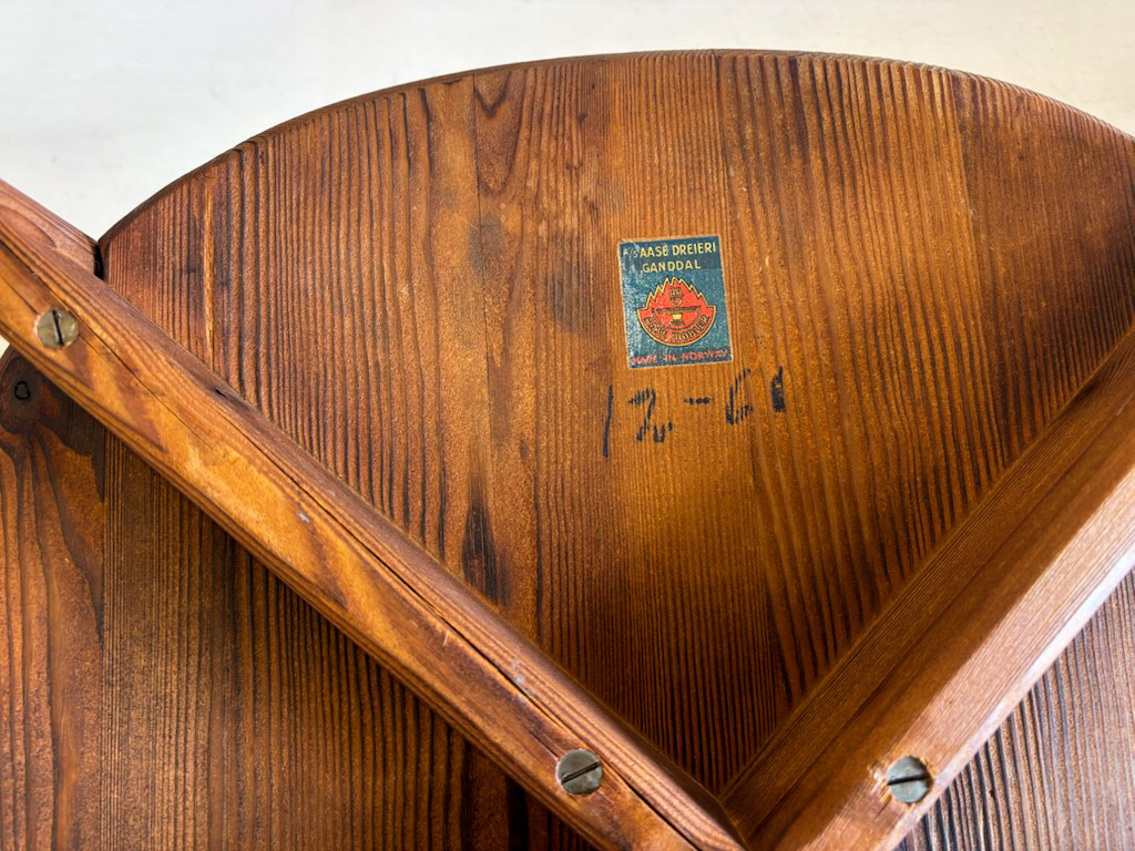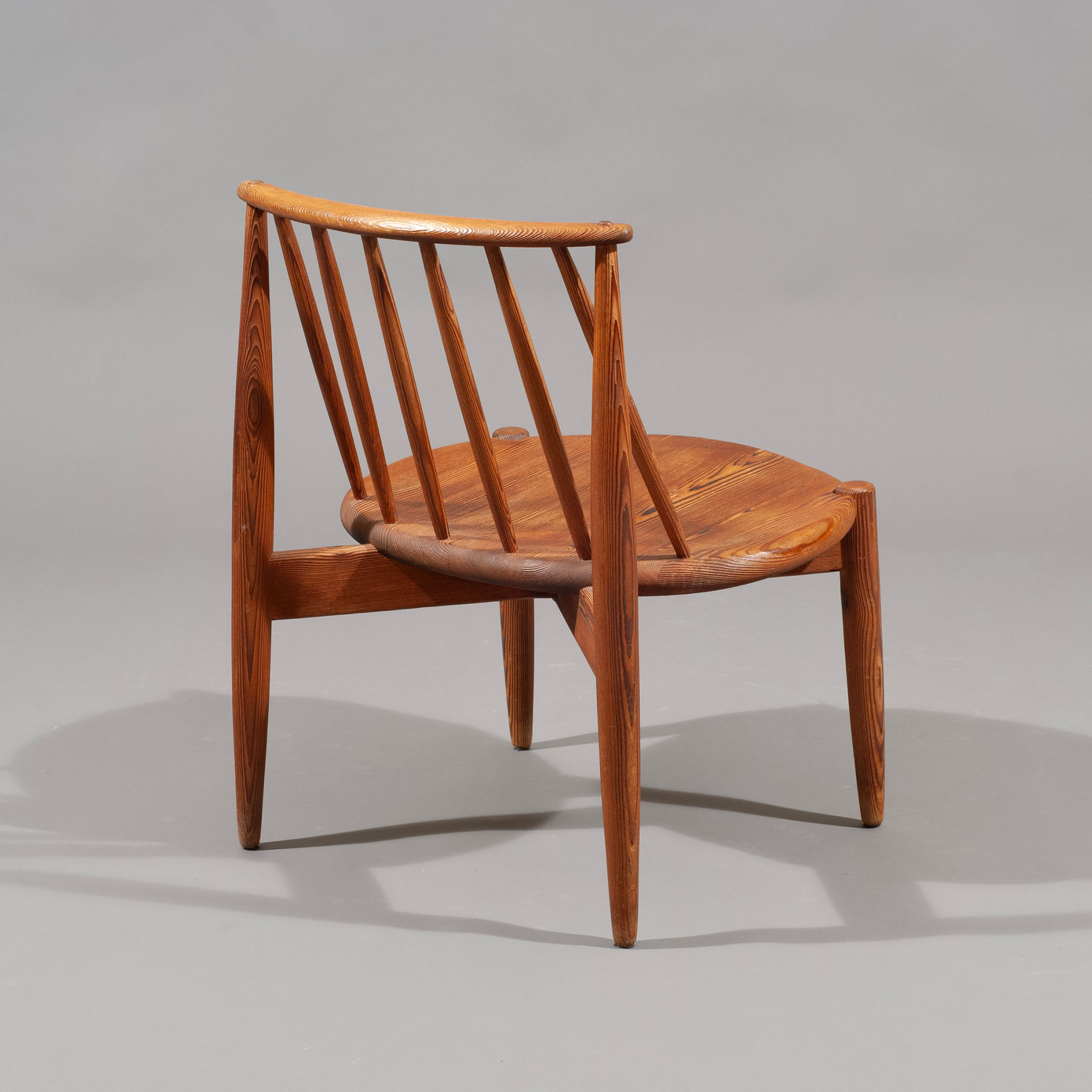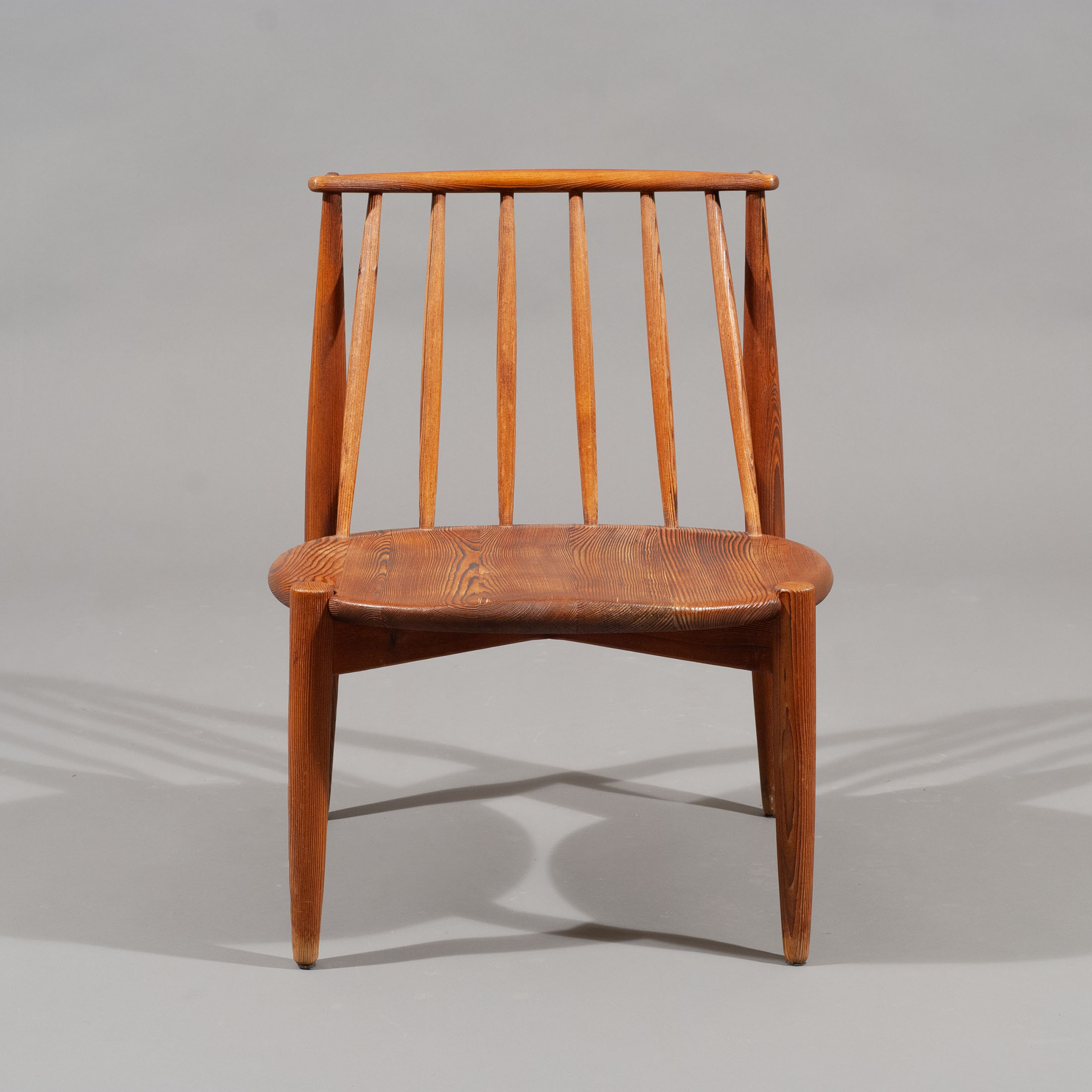A very rare fireplace chair. A low fireplace chair in smoked and sandblasted or brushed pine. This stick chair, dated December 1961, probably belongs to the first production of this series. Vintage. Very good original condition.