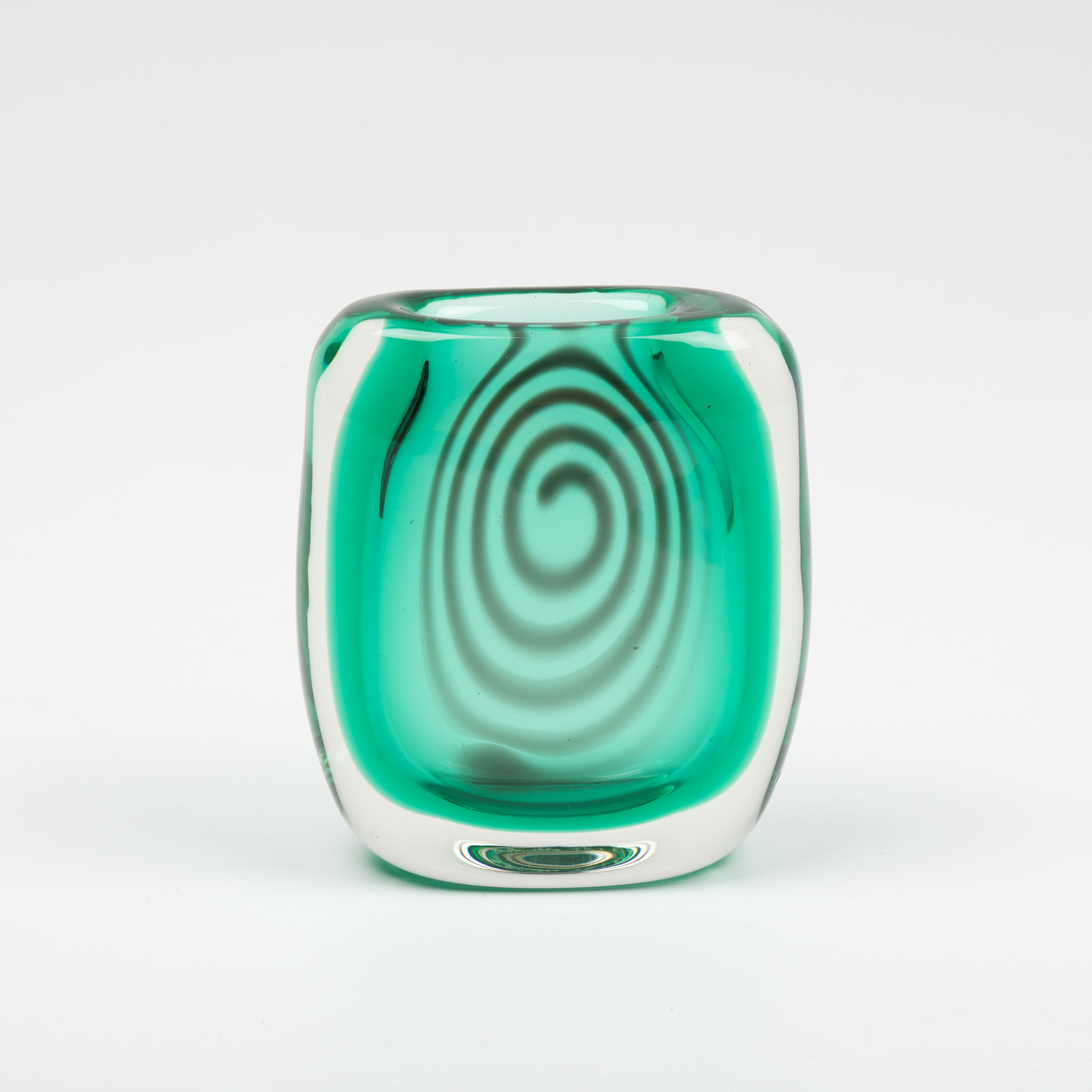 Sjelden munnblåst glassvase med spiral mønster. Modell utstilt i «Design i Scandinavia», vandrende utstilling i USA 1954. Dette eksemplaret fra 1954 ble utlånt og utstilt i «Scandinavian Design og USA 1890- 1980» i Nationalmuseum, Sverige 2021 og Nasjonalmuseet, Norge 2022. Original vintage.